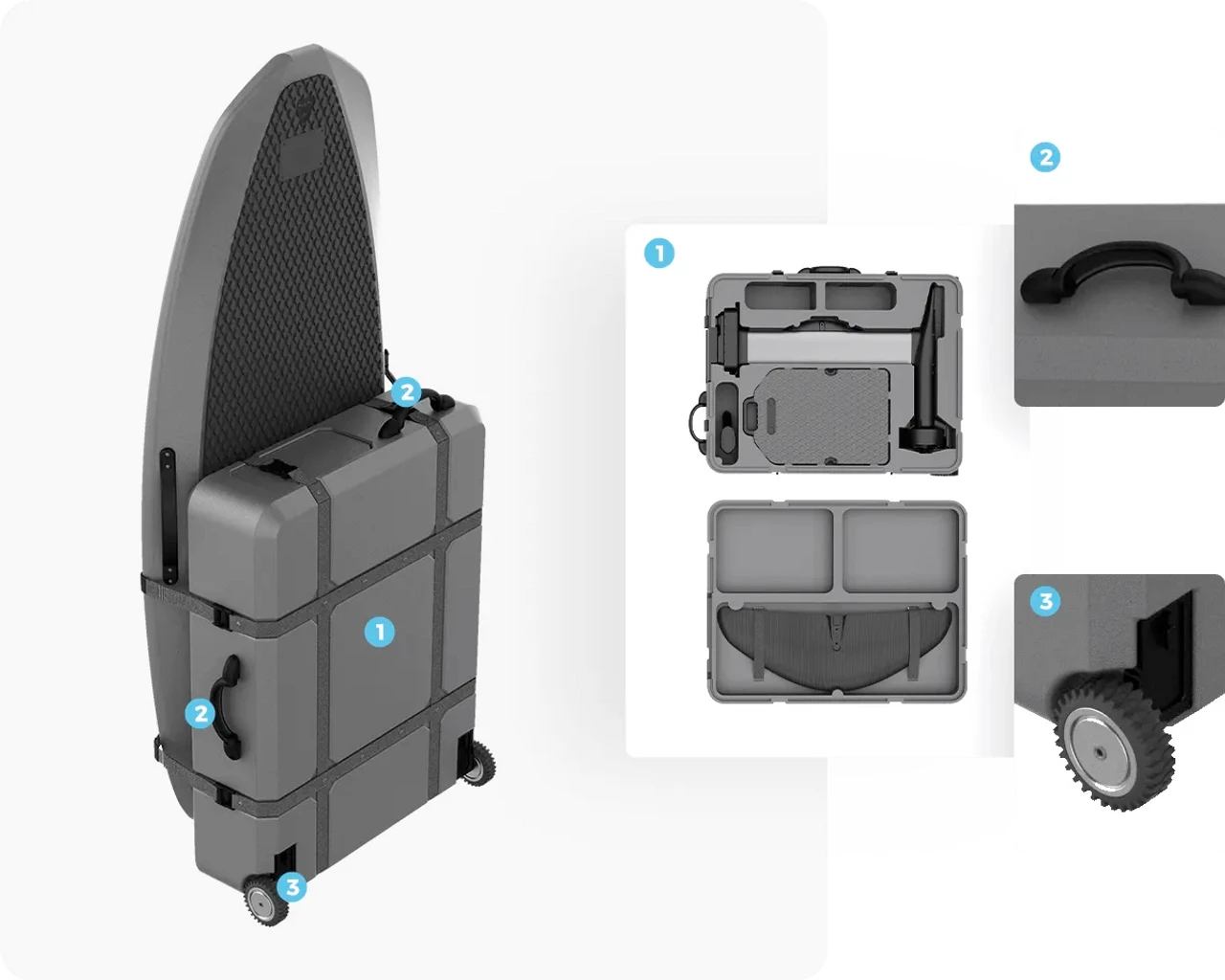 All the accessories required for assembly fit perfectly inside the EPP carrying case while leaving space for your stuff, saving your effort on the package. The board can be strapped to the wheeled case, making it easy to transport, especially in long-range towing. Travel with Waydoo Flyer ONE Plus eFoil is a breeze.